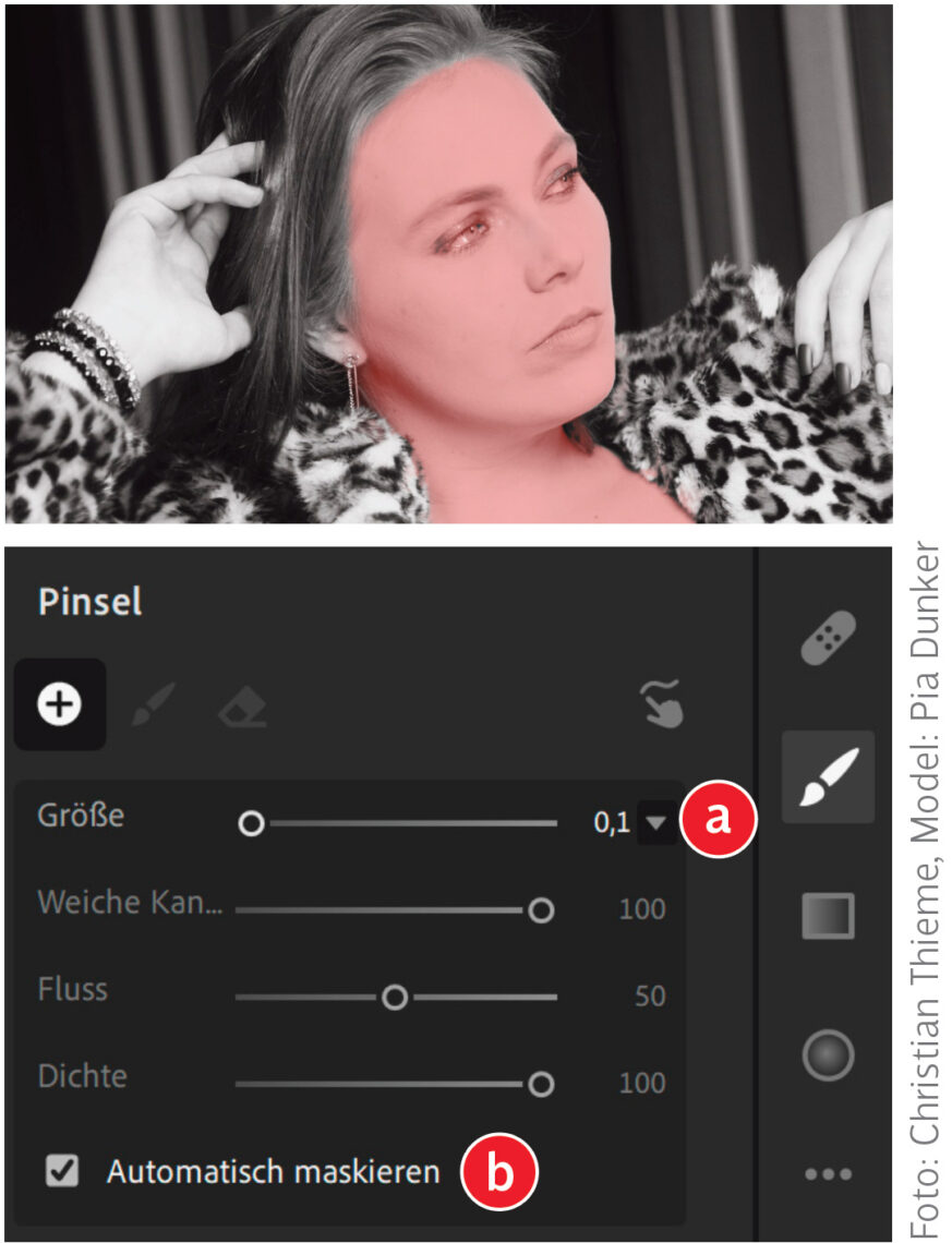 Lightroom unterstützt Sie dabei, Bildbereiche präzise auszuwählen. Mit der Funktion »Automatisch maskieren« hilft Ihnen die Software bei der Auswahl einzelner Bildbereiche, wie hier bei einem Gesicht. Wechseln Sie hierfür zum »Pinsel«-Werkzeug und klicken Sie auf das kleine Dreieck (a), um sich weitere Funktionen anzeigen zu lassen. Setzen Sie einen Haken bei »Automatisch maskieren« (b) und nehmen Sie bei Bedarf Feineinstellungen an der Pinselspitze vor.