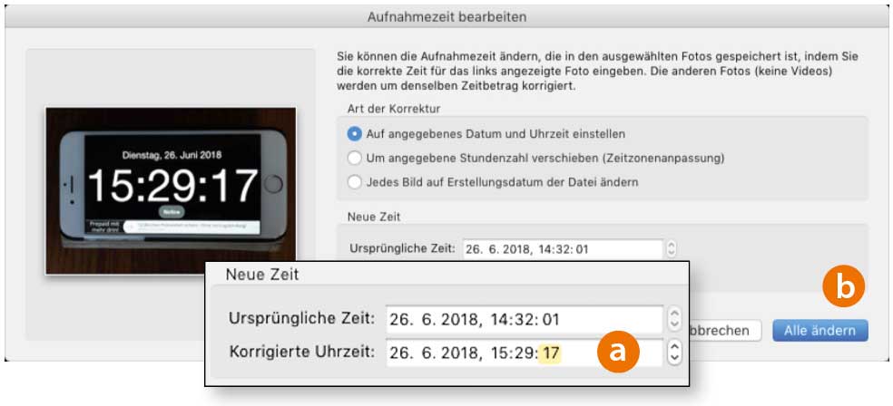Wenn es doch einmal genauer sein muss, sollten Sie mit sämtlichen Kameras eine Uhr mit Sekundenanzeige fotografieren. Wenn Sie dann das Uhrzeitfoto und die übrigen mit der jeweiligen Kamera gemachten Aufnahmen auswählen, können Sie die in den Metadaten der Bilddateien eingetragene Uhrzeit im Nachhinein per »Metadaten > Aufnahmezeit bearbeiten« exakt justieren. Geben Sie die Uhrzeit der fotografierten Uhr als »Korrigierte Uhrzeit« (a) ein und klicken Sie auf »Alle ändern« (b). Die Aufnahmezeiten aller mit ausgewählten Bilddateien werden dann um die gleiche Differenz verschoben. Zur Auswahl der anzupassenden Bilddateien nutzen Sie den Metadaten-Browser der »Bibliothek« und wählen das jeweilige Kameramodell aus (c).