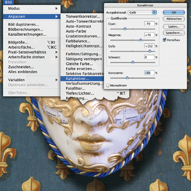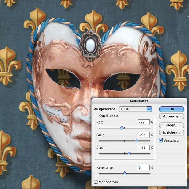 Unter „Bild > Anpassen (vor CS: Einstellungen) > Kanalmixer“ finden Sie ein Dialogfeld, das auf den ersten Blick der „Selektiven Farbkorrektur“ ähnelt: Auch hier nehmen Sie Veränderung der Grundfarben-Anteile durch Anpassung der anderen Komponenten vor. Im Ergebnis wirkt der Kanalmixer allerdings völlig anders. Am häufigsten du?rfte er eingesetzt werden, um aus einem Farbbild ein ausgewogenes Graustufenbild zu machen (ausfu?hrlich dazu Band 12 „Schwarzweiß-Labor“); bei dieser Anwendung aktivieren Sie unten links die Ausgabe-Option „Monochrom“ und regeln die Anteile der vorhandenen Farbkanäle an den resultierenden Graustufen. Ebenso lassen sich die Regler aber auch nutzen, um Farbänderungen vorzunehmen. Die rechte Hälfte der Karnevalsmaske entstand mit den oben rechts vorgenommenen Einstellungen.
