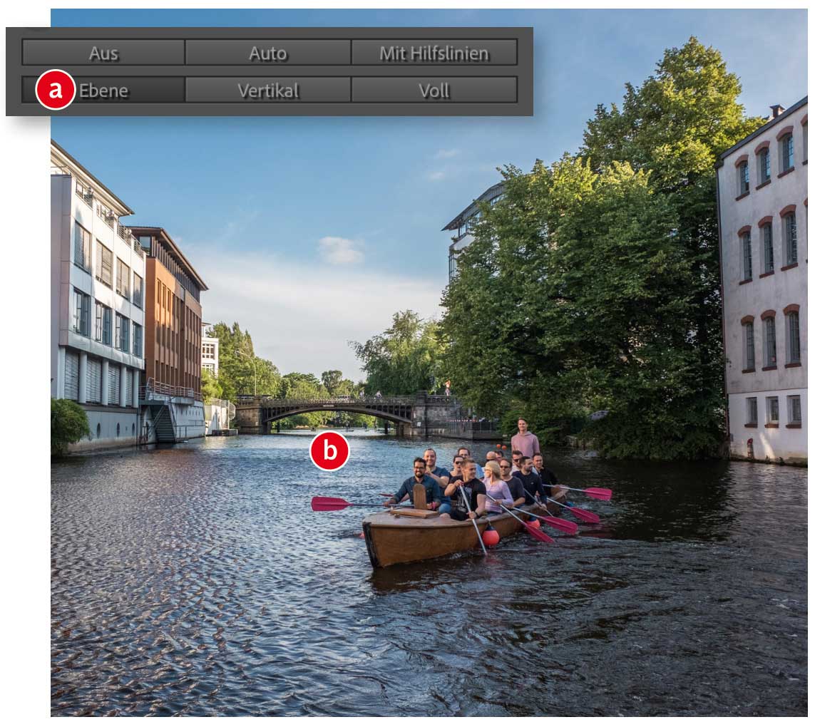 Bei der automatischen Perspektivkorrektur beschränken Sie mit einem Klick auf »Ebene« (a) die Korrekturen auf die gerade Ausrichtung des Horizonts, während beispielsweise stürzende Linien unkorrigiert bleiben. Diese Automatik arbeitet selbst dann recht zuverlässig, wenn der Horizont nicht so leicht erkennbar ist (b). Wie »Auto« ignoriert auch »Ebene« die Einstellung »Zuschnitt beschränken«.