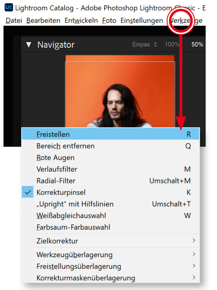 Die Menüleiste in Lightroom lässt sich unter Windows problemlos über Tastaturkürzel bedienen. Manchmal arbeitet man schneller über die Tastatur als mit der Maus. Das obere Menüband in Lightroom und Lightroom Classic können Sie auch über die »Alt«-Taste aktivieren. Es erscheinen kleine Unterstriche unter den Buchstaben der einzelnen Menübefehle. Drücken Sie die jeweilige Taste auf der Tastatur, um das Drop-down-Menü zu öffnen. Navigieren Sie mit den Cursor-Tasten durch das Menüband und bestätigen Sie Befehle mit der »Enter«-Taste.