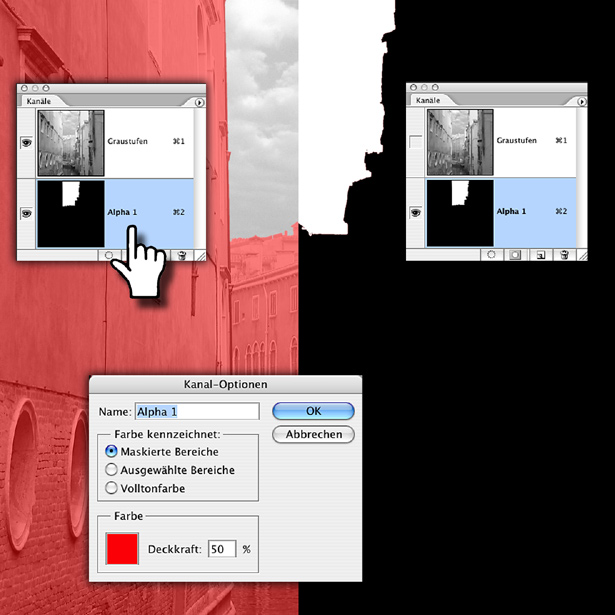 Das Einstellungsbedienfeld für die Kanal-Optionen können Sie öffnen, indem Sie die Zeile des entsprechenden Kanals doppelt anklicken. Vorgegeben ist die Farbe Rot mit 50 Prozent Deckkraft (links im Bild) – das entspricht ungefähr der Ansicht des Maskierungsfilms, den man zum Abkleben bei analogen Fotomontagen verwendet. Klicken Sie auf das Farbfeld, so öffnet sich ein Farbwähler, aus dem Sie jede beliebige andere Farbe als Maskenfarbe festlegen können. Erscheint Ihnen die Überlagerung durch die Maske im Bild zu stark oder zu schwach, geben Sie im Feld „Deckkraft“ einen neuen Wert ein. Die rechte Bildhälfte entspricht der Ansicht am Monitor, wenn der Graustufenkanal ausgeblendet ist und Sie nur die Maske im Alphakanal selbst sehen.