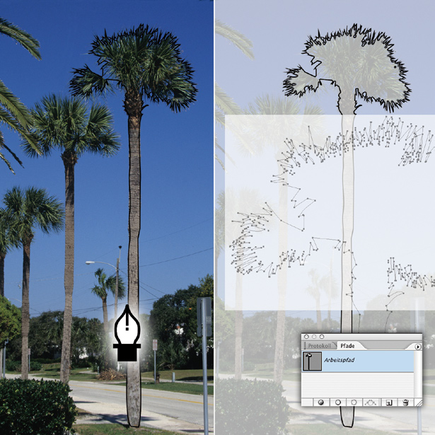 Sie können einer Lasso-Auswahl zwar Bereiche hinzufügen oder sie abziehen, aber nur durch erneutes manuelles Umfahren des gewünschten Bereichs. Anders ist das bei Pfaden, die Sie mit dem Zeichenstift-Werkzeug erzeugen (rechts vor aufgehelltem Hintergrund besser erkennbar). Ein Pfad kann aus geraden Segmenten und Kurven bestehen. Der Verlauf eines Pfades wird durch die Strecke zwischen zwei per Klick entstandenen Ankerpunkten definiert. Die Position dieser Punkte können Sie nachträglich ebenso verändern wie den Kurvenverlauf. Gerade und gleichmäßig geschwungene Konturen wie der Palmenstamm lassen sich mit diesem Werkzeug besser als mit dem Lasso festlegen. Eine Vergrößerung der Blätter zeigt allerdings so viele zu setzende Ankerpunkte, dass ein Pfad dort offensichtlich nicht effektiv ist.