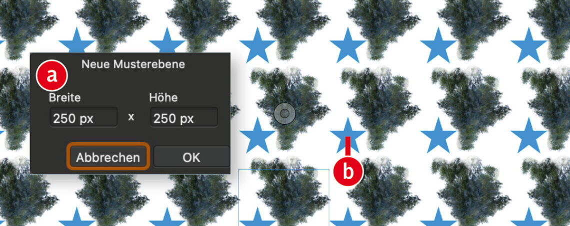 Dank des Ebenentyps »Musterebene« ist das Anlegen und Variieren von Mustern schnell und einfach möglich. Über »Ebene > Neue Musterebene« öffnen Sie einen Dialog (a), in dem Sie die Mustergröße festlegen. Anschließend können Sie auf der Musterebene Pixel erzeugen. Währenddessen sehen Sie sofort das Ergebnis des Musters. Nutzen Sie beispielsweise den Pinsel, um zu malen. Wenn Sie Vektorformen, wie etwa einen Stern (b) im Muster benutzen möchten, müssen Sie diese nur per »Strg/Cmd-E« mit der Musterebene zusammenlegen (also rastern), und Sie erhalten wiederum sofort das Ergebnis. Die Musterebene lässt sich bei aktivem »Verschieben«-Werkzeug drehen und skalieren. Sie können Sie auch kopieren und in andere Dateien einfügen.