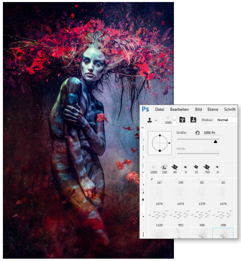 Variieren Sie die Pinselspitze und setzen Sie auch die Möglichkeiten der »Pinsel«-Palette ein. Mit ein wenig Übung werden Sie so sehr schnell ein Meister der surrealen Partikelbildwelten.