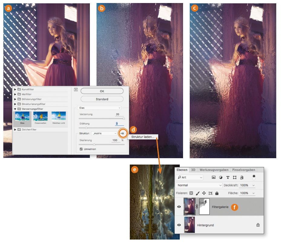 Mit dem »Versetzen«-Filter lassen sich interessante Effekte erzeugen. Jedoch bietet er weder eine direkte Sichtkontrolle, noch die Möglichkeit, die Verschiebenmatrix zu glätten. Für kleinere Verschiebungseffekte hat der Stilisierungsfilter »Glas«, den Sie in der »Filtergalerie« finden, genau diese Vorteile. Unter dem unscheinbaren »Struktur«-Menü (d) können Sie ein Bild im PSD-Format (e; im Beispiel um 90° gedreht angewendet) als Matrix laden. Mit »Glättung« soften Sie die Matrix und dadurch auch den Verschiebungseffekt. Mit »Verzerrung« und »Skalierung« passen Sie die sofort sichtbare Filterwirkung nach Ihren Vorstellungen an (b). Anschließend blenden Sie mit einer Ebenenmaske das gefilterterte Ebenen-Duplikat (f) an den Stellen aus, an denen das Original (a) zu sehen sein soll.