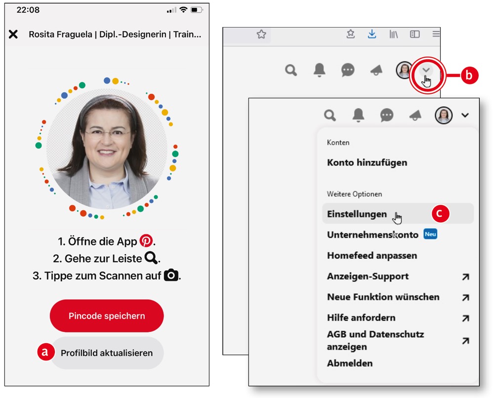 Entscheiden Sie sich für ein quadratisches Bild mit mindestens 280×280 Pixel. Es handelt sich zugleich um die optimale Größe. Hat das Bild mehr Pixel, wird es von ­Pinterest automatisch auf 280x 280 Pixel verkleinert. Von hoch- und querformatigen Bildern legt Pinterest automatisch den mittleren quadratischen Bereich als zukünftiges Profilbild fest. Von dem Bild wird später stets ein kreisförmiger Ausschnitt angezeigt. Sie laden ein Profilbild hoch, indem Sie in der Pinterest-App auf dem Smartphone beziehungsweise Tablet auf Ihr Profilbild und dann auf den Button »Profilbild aktualisieren« tippen (a). Auf einem Computer müssen Sie im Browser einen kleinen Umweg nehmen: Klicken Sie im Internet-Browser auf Ihrem Pinterest-Profil ganz oben rechts auf den kleinen Pfeil (b). Es erscheint ein Dropdown-Menü. Über »Einstellungen« (c) gelangen Sie zum Bereich »Profil bearbeiten«. Hier können Sie Ihr Bild auswechseln.