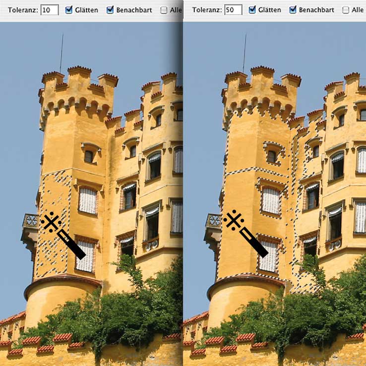 Es gibt in der Optionenleiste am Kopf des Monitors verschiedene Einstellungen, mit denen Sie die Wirkungsweise des Zauberstabs näher bestimmen. Besonders wichtig ist das Feld „Toleranz“, in dem Sie über die Tastatur einen numerischen Wert zwischen Null und 255 eingeben können. Diese Ziffern stehen für die 256 Abstufungen jedes Farbkanals (im 8-Bit-Modus). Je niedriger der eingegebene Wert ist, um so dichter liegen die ausgewählten Farben an dem Farbton, den Sie durch Anklicken mit dem Kreuz an der Werkzeugspitze festgelegt haben. Daher ist der Auswahlbereich links mit dem Wert 10 kleiner als der rechts mit 50, weil hier auch weniger ähnliche Farben einbezogen wurden.