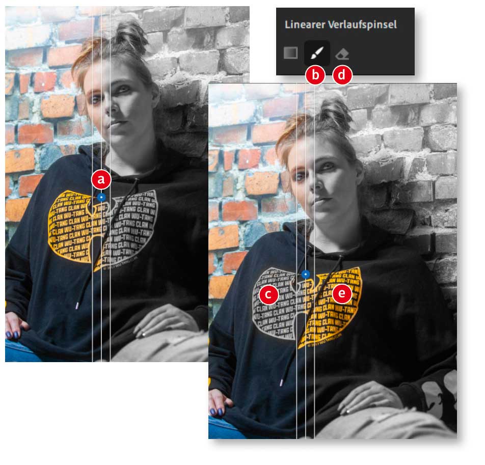 Mit ein paar einfachen Schritten können Sie in der Mobilversion von Lightroom kreative Farbverläufe erzeugen und mit einem Pinsel nachbearbeiten. Aktivieren Sie das Werkzeug »Linearer Verlauf« und ziehen Sie einen Verlauf über einen Teil des Bildes. (a). Stellen Sie nun den Wert für »Sättigung« auf −100. Sie erhalten einen Verlauf von Farbe zu Schwarzweiß. In diesem Beispiel ist die Absicht, die linke Seite des Aufdrucks schwarzweiß darzustellen und die rechte Hälfte farbig. Wählen Sie den »Linearen Verlaufspinsel« (b) und malen Sie über die linke Logohälfte (c), bis der Bereich entsättigt ist. Um die rechte Hälfte farbig darzustellen (e), nutzen Sie den »Linearen Verlaufsradiergummi« (d) auf die gleiche Weise. Um schnell zwischen dem Verlaufspinsel und dem Radiergummi zu wechseln, halten Sie die »Alt«-Taste gedrückt.