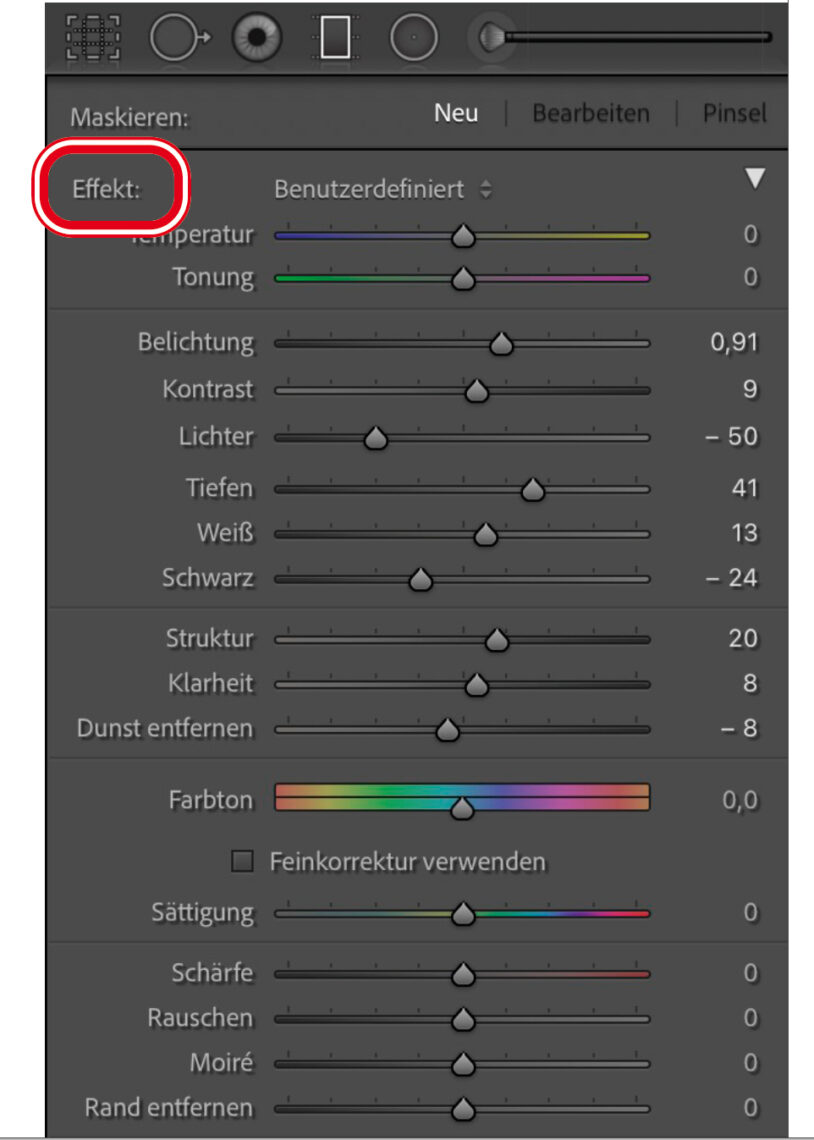 Die selektiven Werkzeuge von Lightroom Classic merken sich die zuletzt genutzten Einstellungen. Falls Sie diese nicht verwenden wollen, müssen Sie nicht jeden Regler einzeln zurücksetzen. Adobe hat sich – anders als in Camera Raw – für eine effektive, aber wenig intuitive Lösung entschieden: Klicken Sie entweder mit gehaltener Alt-Taste oder mit einem Doppelklick auf »­Effekt«, um alle Regler auf einmal zurückzusetzen.
