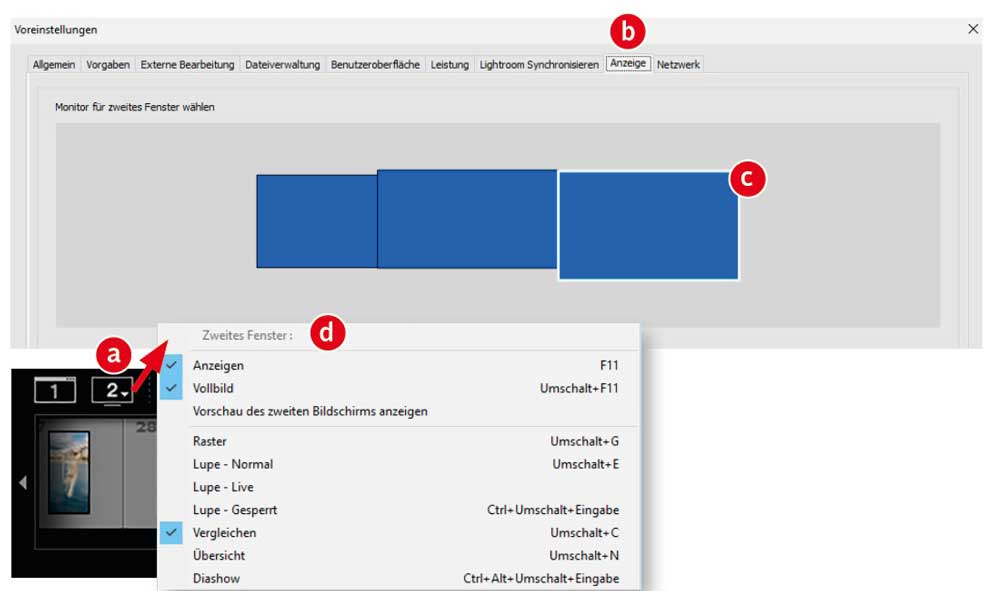 Viele Fotografen arbeiten erst durch die Verwendung eines zweiten Monitors in Lightroom Classic richtig produktiv. Mit der Taste »F11« oder einem Klick auf das Symbol für den zweiten Monitor (a) aktivieren Sie den Dualmonitorbetrieb. Der Zielmonitor wird über »Bearbeiten > Voreinstellungen > Anzeige« (b) festgelegt. Die weiße Umrandung (c) zeigt die aktuelle Monitorauswahl an. Klicken Sie etwa eine halbe Sekunde auf das Monitorsymbol (a), und es erscheint ein Menü, in dem Sie aus einer Liste (d) eine Funktion aussuchen können, die auf dem Zweitmonitor dargestellt wird.