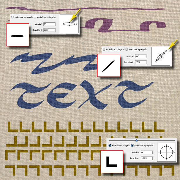 Der Airbrush (manche sagen auch ?die?) ist heute nicht mehr als eigenständiges Tool in der Werkzeug-Palette vertreten, es gibt ihn nur noch als Variante des Pinsels. Seit große, weich begrenzte Malspitzen für alle Werkzeuge verfügbar sind, die Spuren im Bild hinterlassen, gibt es für ihn keine Notwendigkeit mehr. Dass er dennoch als zuschaltbare Option des Pinsels (eingeblendete Optionenleiste ganz rechts) angeboten wird, hat nur mit einer einzigen Funktion zu tun: Halten Sie eine Pinselspitze bei gedrückter Maustaste oder niedergedrücktem Malstift des Grafiktabletts längere Zeit auf einer Stelle, entsteht ein Abdruck wie beim einmaligen Klicken auf die Arbeitsfläche. Beim Airbrush dehnt sich der Durchmesser des Abdrucks langsam aus. Auch hier sehen Sie ganz unten wieder eine realistischere, fortgeschrittene Airbrush-Spur.
