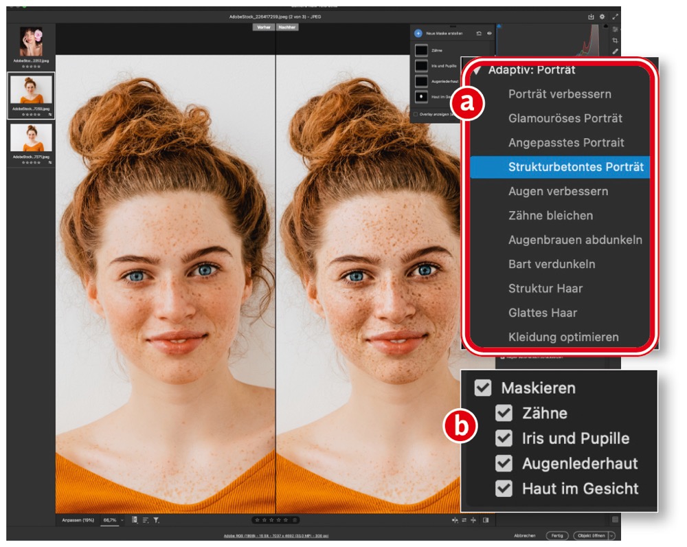 Camera Raw generiert KI-Masken für Himmel, Motive, Personen (einschließlich Erkennung von Haut, Augen, Kleidung, Haaren …) aus den jeweiligen Bildinhalten. Übertragen Sie KI-Masken durch Kopieren und Einfügen auf andere Fotos, werden die automatisch an den unterschiedlichen Bildinhalt angepasst – sie sind also „adaptiv“. Das ermöglicht auch sogenannte adaptive Presets, von denen Sie einige vorinstalliert im »Presets«-Bereich finden (a). Eigene adaptive Presets können Sie einfach anlegen, indem Sie im »Preset erstellen«-Dialog »Maskieren« und dann die gewünschten KI-Masken aktivieren (b).
