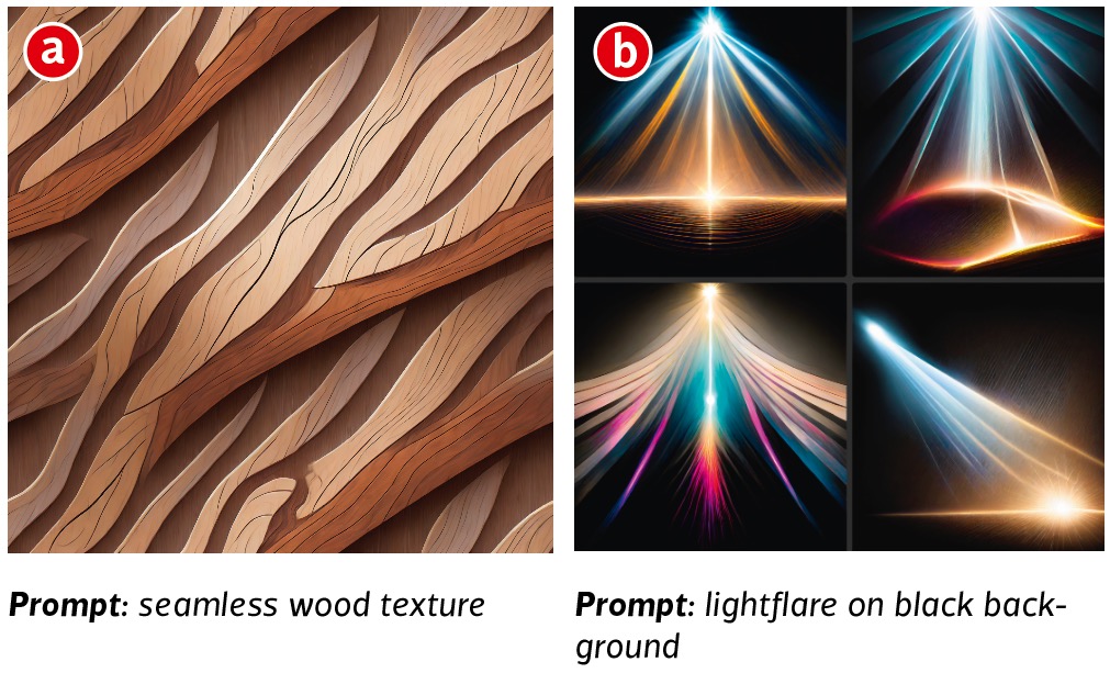 Manche Elemente wie etwa kachelbare Oberflächentexturen (a) oder Lichtreflexe (b) benötigt man häufiger. Statt diese jedes Mal neu zu generieren und damit immer wieder Credits zu verbrauchen, die einem dann später fehlen, können Sie mit Firefly oder der »Generativen Füllung« in Photoshop wiederverwendbare Assets generieren. Diese speichern Sie dann in einer CC-Bibliothek oder auf der Festplatte und ziehen Sie bei Bedarf ins Bild. Die Lightflares sollten Sie auf einem schwarzen Hintergrund erzeugen lassen, damit Sie diese einfach mit der Füllmethode »Negativ multiplizieren« verrechnen können.