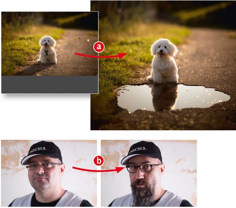 Falls Sie einmal ein Bildbearbeitungsproblem haben, fragen Sie sich, ob Ihnen die »Generative Füllung«nicht bei der Lösung helfen kann. Ausgebrannte Stellen auf Haut, Haare oder Fell ausbessern? Ganze Bildbereiche entfernen oder abändern – oder gleich das ganze Bild erweitern? Einem Bild eine Pfütze hinzufügen – inklusive der automatisch erzeugten Spiegelungen (a), Gesichter etwa zur Anonymisierung verändern (b), Hintergründe austauschen, die Kleidung wechseln? All das funktioniert bereits. Die einzige Einschränkung dabei ist noch die geringe Größe der generierten Elemente. Diese werden immer nur mit 1024 × 1024 Pixeln erzeugt und sind deshalb für größere Ausgabezwecke noch wenig geeignet. Für ausschließlich im Web gezeigte Bilder spielt das aber keine Rolle.