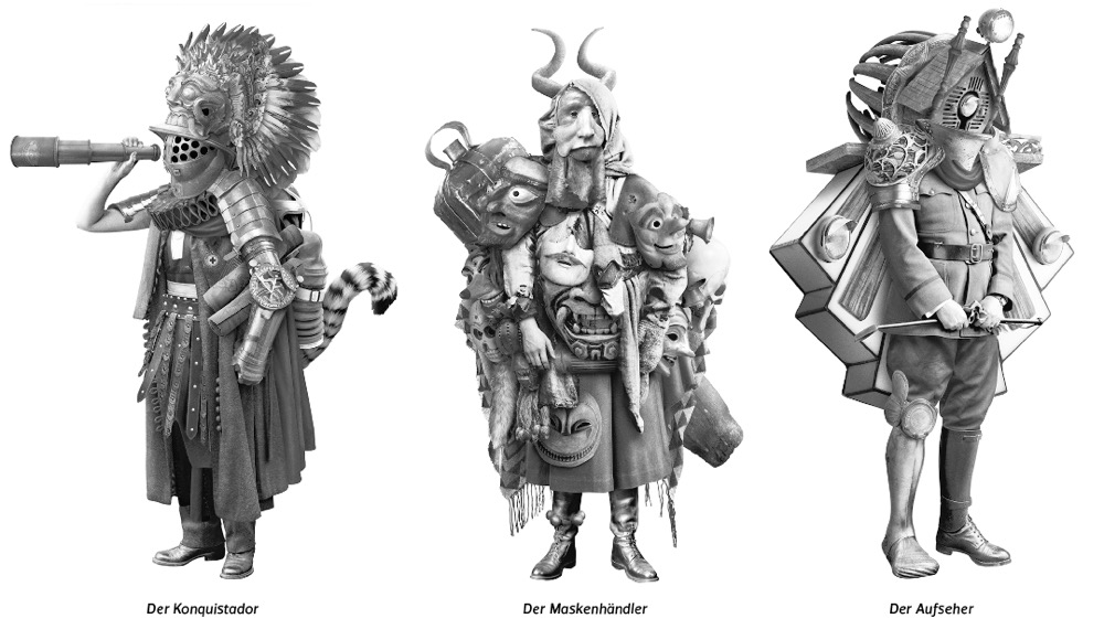 Die Idee zu diesem Projekt entwickelte Steve während der Corona-Krise, als er weder seine Punk-Community dokumentieren konnte, noch mangels eines eigenen Ateliers besonders viel Platz zum Arbeiten hatte. Er war genervt. Vor allem vom Jammern und Klagen in seiner Künstler-Blase, deren Mitglieder sich zur Untätigkeit verurteilt sahen. Als Ausweg besann er sich auf die Lieblingsbeschäftigung seiner Jugend auf dem flachen Land: Rollen- und Videospiele. Fasziniert hatte ihn daran vor allem die Ausgestaltung der Charaktere und Figuren. Als er dann noch auf einen philosophischen Text Heinz-Ulrich Nennens über die Masken der Götter stieß, fand er darin die ausschlag- und später titelgebende Anregung für sein Corona-Projekt. Nennen beschreibt, wie sich die Bilder der antiken griechischen und römischen Götter entwickelt haben und wie „Götter verkörpern, … wofür sie allegorisch einstehen“. Praktisch umgesetzt heißt das, sie müssen – wie Figuren in Rollenspielen – ihre Merkmale, Fähigkeiten und Besonderheiten vor allem über ihre Kleidung, ihre Accessoires sowie ihre Werkzeuge und Waffen symbolisieren.