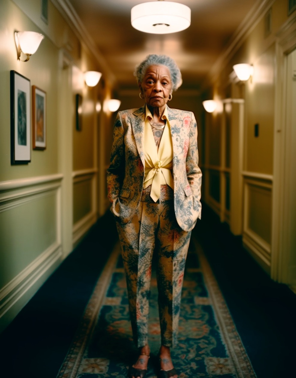 Marie: Am meisten haben mich die sozialen Vorurteile der KI gestört: Ich wollte eine alte Schwarze Frau (Anm. d. Red: Leonie Marie Hübner bestand darauf, das Adjektiv schwarz in diesem Kontext mit großem „S“ zu schreiben.) mit Tätowierungen darstellen. Aber ich bekam lange Zeit nur Figuren, die wie sozial stark benachteiligte Drogenopfer aussahen. Es war ein langer Prozess, bis auf dem Bild endlich eine anmutige Frau zu sehen war. Geholfen hat, sie in einer höheren Gesellschaftsschicht zu verorten. Um die KI dazu zu motivieren, ein Bild zu liefern, das meinen diesbezüglichen Vorstellungen entspricht, musste ich ihr ziemlich genau erklären, was die Frau tragen soll und wie ich mir die Umgebung vorstelle. Aber gerade dieses Ringen mit der KI, war ein sehr lehrreiches Experimentierfeld, das zwischen Frustration und gespannter Erwartung angesiedelt war. Erstaunlich wenig Probleme hatte ich beim Thema Tattoo mit der sonst so restriktiv unterdrückten Nacktheit. Midjourney produzierte ständig Bilder von Frauen mit nackten Brüsten, obwohl ich das nicht wollte und es in den meisten Fällen auch gar nicht zur Adaption des Tattoo-Themas passte.