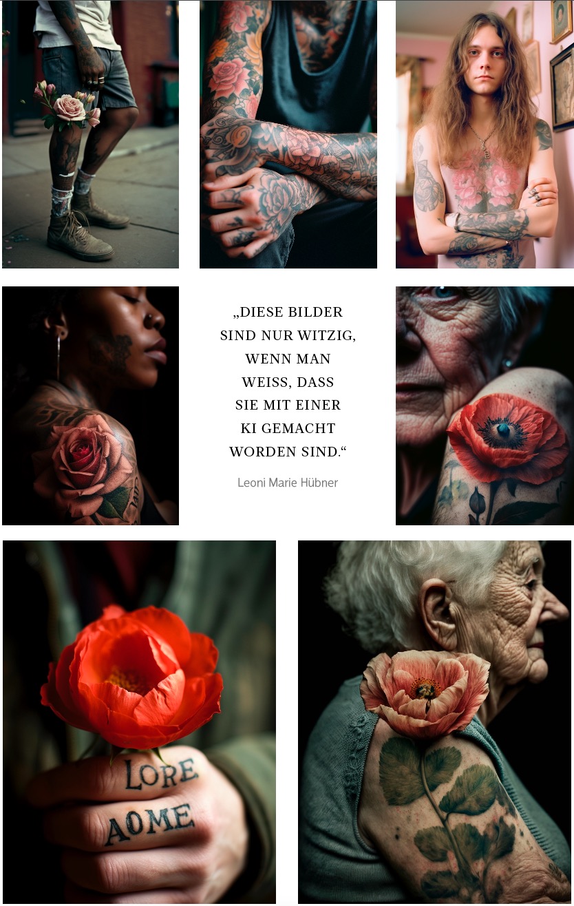 Marie: Das war schon eine größere Herausforderung. Einfach nur Menschen, Blumen und Tattoos als Begriffe im Prompt zu mischen, führte zu ziemlich seltsamen Ergebnissen. Da wuchsen alten Damen Rosen aus dem Arm, und wenn mal ein brauchbares Blumen-Tattoo in der Auswahl war, konnte ich die Blumensorte erst mal nicht kontrollieren.