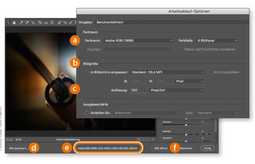 Die unten im Camera Raw-Dialog angezeigten Bildinformationen (e) sind ein anklickbarer Link, der den etwas sperrig benannten Dialog »Arbeitsablauf-Optionen« öffnet. Kennt man diese Option nicht, würde man als Anwender wohl kaum versucht sein, darauf zu klicken. Doch dadurch öffnen Sie einen sehr nützlichen Dialog, in dem Sie den »Farbraum« (a), die »Bildgröße« (b) und die »Ausgabeschärfe« (c) für die geöffneten Bilder festlegen. Diese Einstellungen werden sowohl beim Exportieren mittels »Bild speichern« (d) als auch bei der Übergabe an Photoshop über »Bild öffnen« (f) angewendet.