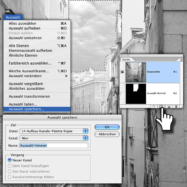 Alphakanäle sind bei der Bildbearbeitung nur als ein Hilfsmittel wichtig, das dazu dient, später Veränderungen in ganz bestimmten Bereichen des Bildes zu bewirken. Der hier ausgewählte Himmel – und nur dieser – soll in weiteren Schritten mehrfach benutzt werden. Dazu mu?ssten sie ihn jedes Mal aufs Neue auswählen, sofern Sie zwischendurch etwas tun, das das komplette Bild betrifft. Da immer nur eine Auswahl gleichzeitig vorhanden sein kann – auch, wenn sie wie bei dem Beispiel gegenu?ber aus mehreren Teil-Auswahlen besteht –, ist es mitunter sinnvoll, sie fu?r spätere Wiederverwendung aufzubewahren. Das „Einfrieren“ von Auswahlen ist einer der Hauptzwecke der Alphakanäle. Dazu gehen Sie entweder u?ber das Auswahl-Menu? „Auswahl speichern“ oder Sie klicken am Fuß der Palette auf „Auswahl als Kanal speichern“.