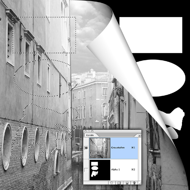 Da immer nur eine Auswahl gleichzeitig vorhanden sein kann, ist es oft sinnvoll, sie fu?r spätere Wiederverwendung als Alphakanal zu speichern.