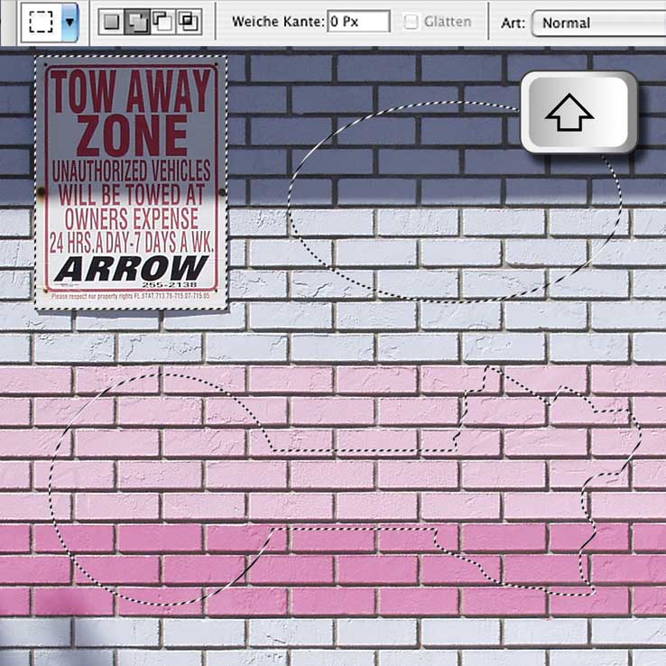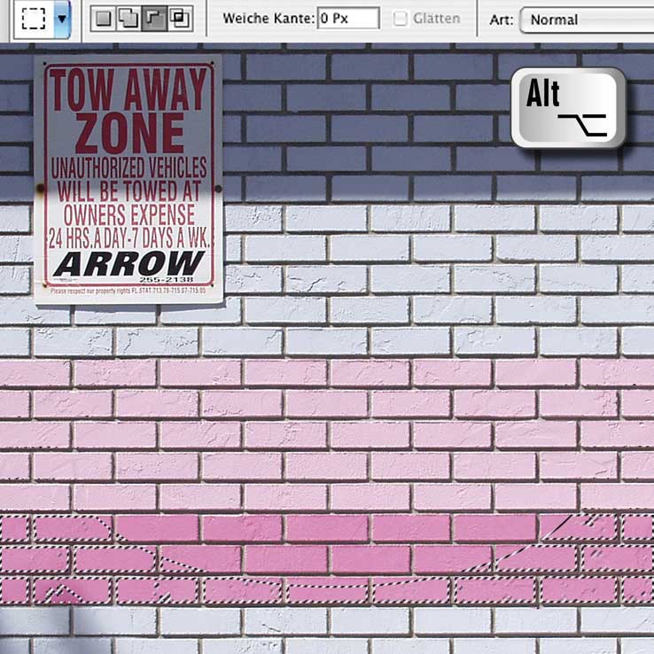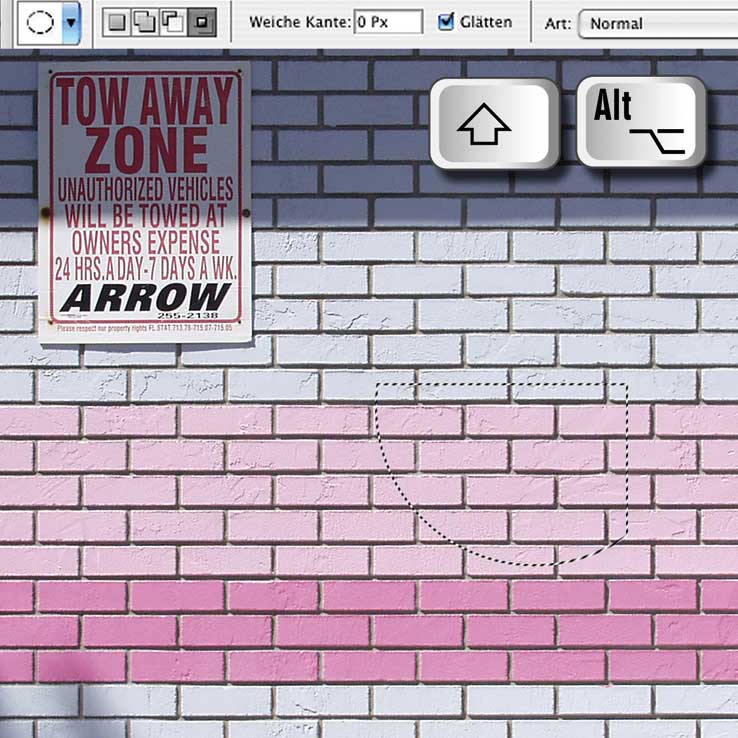 In entsprechender Weise können Sie eine neue Auswahl von einer bereits vorhandenen abziehen, indem Sie dabei die Alt-Taste drücken; in der Optionen-Palette ist dann das dritte Symbol aktiviert. Hier habe ich zunächst mit dem Zauberstab bei deaktivierter Option „Benachbart“ die pinkfarbene Backsteinreihe ausgewählt, danach bei gedrückter Alt-Taste eine Ellipse von dieser Farbauswahl abgezogen. Es verbleibt der durch die Auswahlgrenze gekennzeichnete Selektionsbereich.