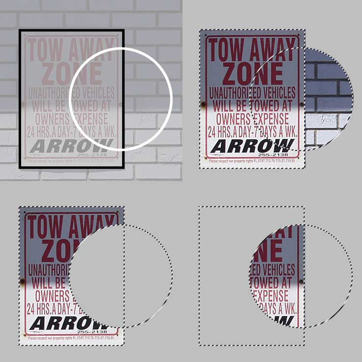 Betrachten wir die drei Möglichkeiten noch einmal nebeneinander: Die Rechteckauswahl des Hinweisschilds und eine überlappende Kreisauswahl (oben links) lassen sich wahlweise durch Addieren der Selektionen kombinieren (rechts oben), der Kreis wird vom Rechteck subtrahiert (links unten) oder die Schnittmenge, der gemeinsame Bereich der beiden Auswahlen, bleibt übrig. Bei Schnittmenge und Addition ist es egal, welche zuerst erzeugt wurde, bei der Subtraktion ziehen Sie immer die spätere von der bereits vorhandenen ab.