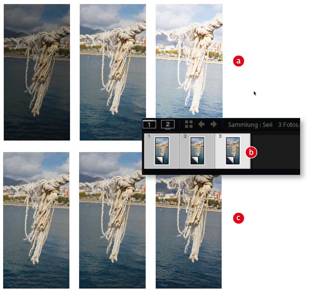 Lightroom Classic erlaubt Ihnen eine automatische Belichtungskorrektur bei einer Fotoserie. Bei Serienaufnahmen können durch die Kameraautomatik oder wechselnde Lichtverhältnisse unterschiedliche Belichtungen entstehen, wie im Beispiel (a) illustriert. Wählen Sie im »Entwickeln«-Modul alle gewünschten Fotos aus und markieren Sie das Foto, das Sie als Referenz (b) festlegen möchten. Über »Einstellungen > Belichtung angleichen« führt Lightroom die Angleichung aus. Im Ergebnis (c) hat Lightroom die Belichtung annähernd angepasst.