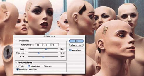 Auch bei der „Farbbalance“ kann man auf die drei Helligkeitsbereiche einzeln zugreifen. Hier ist die Einstellung der Farbkorrekturwerte dagegen deutlich schwieriger. Sie verfügen in jedem Helligkeitsbereich über dieselben drei Regler: Einer betrifft die Farbkreisachse zwischen Cyan und Rot, der zweite die Magenta-Grün- und der dritte die Gelb-Blau-Achse. Man startet in der Regel in den Mitteltönen und nimmt später in Lichtern und Tiefen nur noch Feinabstimmungen vor. Mit welchem Regler man beginnt, ist abhängig von der Vorlage. Einem dominanten Magentastich, wie in unserem linken Bild, begegnen Sie zu Beispiel durch Verschieben des Magenta-Grün-Reglers in Richtung Grün, einem dunklen Blaustich dagegen durch eine Gelbverschiebung des Gelb-Blau-Reglers. Leicht entsteht bei Ausgleich des einen Stichs ein etwas geringfügiger neuer Farbstich, der auch wieder ausgeglichen werden will. Die „Farbbalance“ ist wegen ihrer schwierigen Bedienbarkeit also nur ein Werkzeug für minimale oder farblich sehr spezifische Stiche, bei denen es gut erkennbare Verschiebungen in den beschriebenen Farben gegeben hat, die sich zudem relativ klar in einem der Tonwertbereiche ausmachen lassen. Kurz gesagt: Außer in Spezialfällen lässt man als Einsteiger am besten die Finger von diesem Tool.
