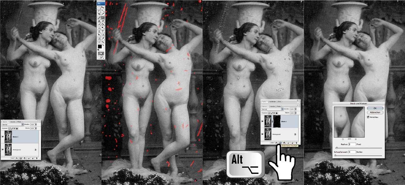 Der Filter „Staub und Kratzer“ hilft als Retuschevorbereitung auch bei Vorlagen mit vielen Knicken und Rissen. Allerdings sollte er dabei nur auf die schadhaften Bildstellen angewandt werden. Duplizieren Sie zunächst die Ausgangsebene. Danach wechseln Sie mit der Taste „Q“ in den Maskierungsmodus und tragen nun vorsichtig mit dem Pinsel eine Maske auf alle betroffenen Bereiche auf. Durch erneutes Drücken der „Q“-Taste verwandeln Sie die Maske in eine Auswahl und kehren diese anschließend mit dem Befehl „Strg+I“ (Mac: „Befehl+I“) um. Die Auswahl verwandeln Sie in eine Ebenenmaske und wenden abschließend den Filter „Staub und Kratzer“ mit geeigneten Werten auf die Ebenenkopie an. Die Alternative: Filter auf Ebenenduplikat anwenden, eine schwarze Ebenenmaske erzeugen und weiße Striche in der Maske auftragen.