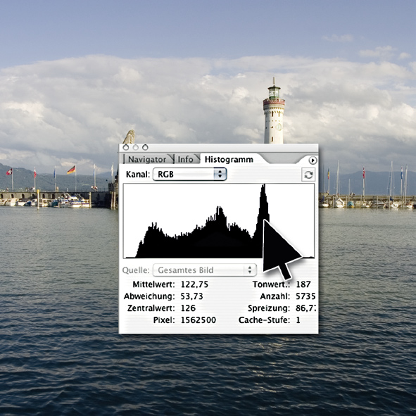Legt man den Mauszeiger auf einen der Balken, zeigt der Tonwert die Helligkeitsstufe (hier 187) an. Die Häufigkeit sagt uns, dass dieser Tonwert 5 735-mal im Bild vorkommt. Die Spreizung gibt an, wie viel Prozent der im Bild befindlichen Pixel dunkler als unser Tonwert sind. Die Cache-Angabe bezieht sich auf die Menge der zur Berechnung genutzten Pixel. Der Wert 1 besagt, dass alle verfügbaren Pixel der (dadurch langsameren) Berechnung zugrunde gelegt wurden. Meist zeigen die unterschiedlichen Cache-Stufen Feinheiten mit wenig Bedeutung für die tägliche Arbeit eines kreativen Bildbearbeiters. Tipp: In den Programmversionen vor Photoshop CS fand sich der Befehl zum Aufruf der Histogrammansicht im „Bild“-Menu? und bot weniger Optionen zur Darstellung der Informationen.