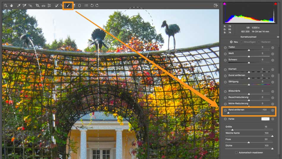- Aktivieren Sie den Korrekturpinsel und setzen Sie die Option »Rand entfernen« auf Null.