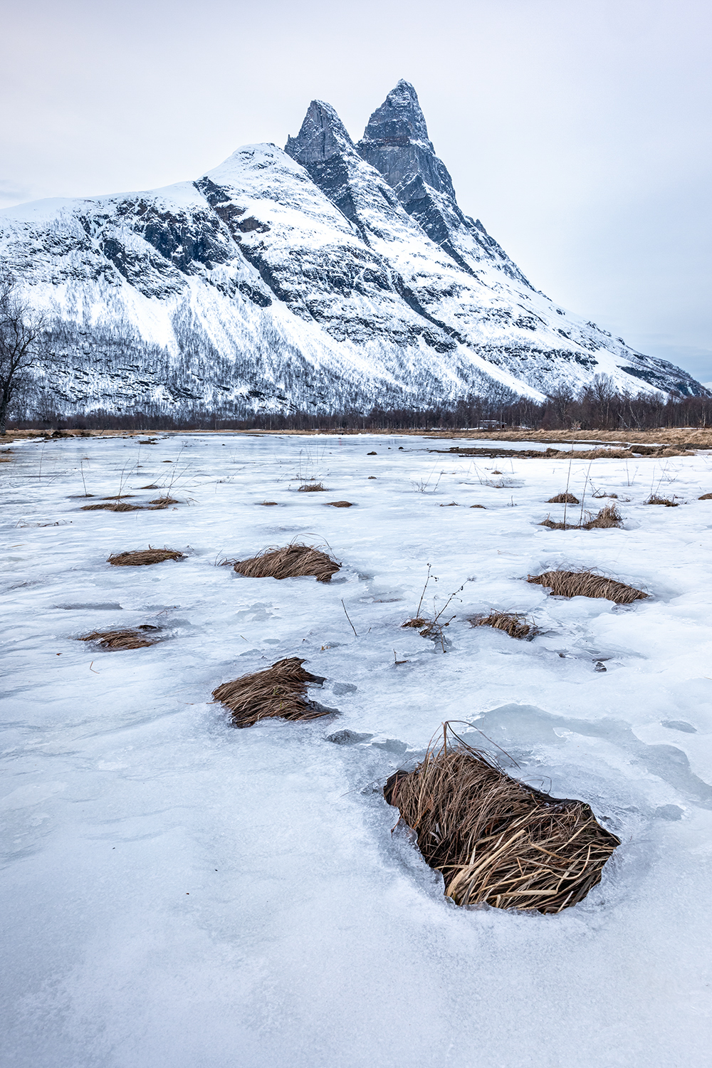 Schnee und Eis helfen uns hierbei ungemein, da sie unwichtige und zu kontrastreiche Details unter sich verbergen, insbesondere im Vordergrund. Solche Bilder wirken aufgeräumter und einzelne „Inseln“ aus Grasbüscheln oder Sträuchern und Bäumchen die durch die Eis- und Schneedecke ragen, werden zu wichtigen Ankerpunkten und geben dem Blick Halt und Orientierung.