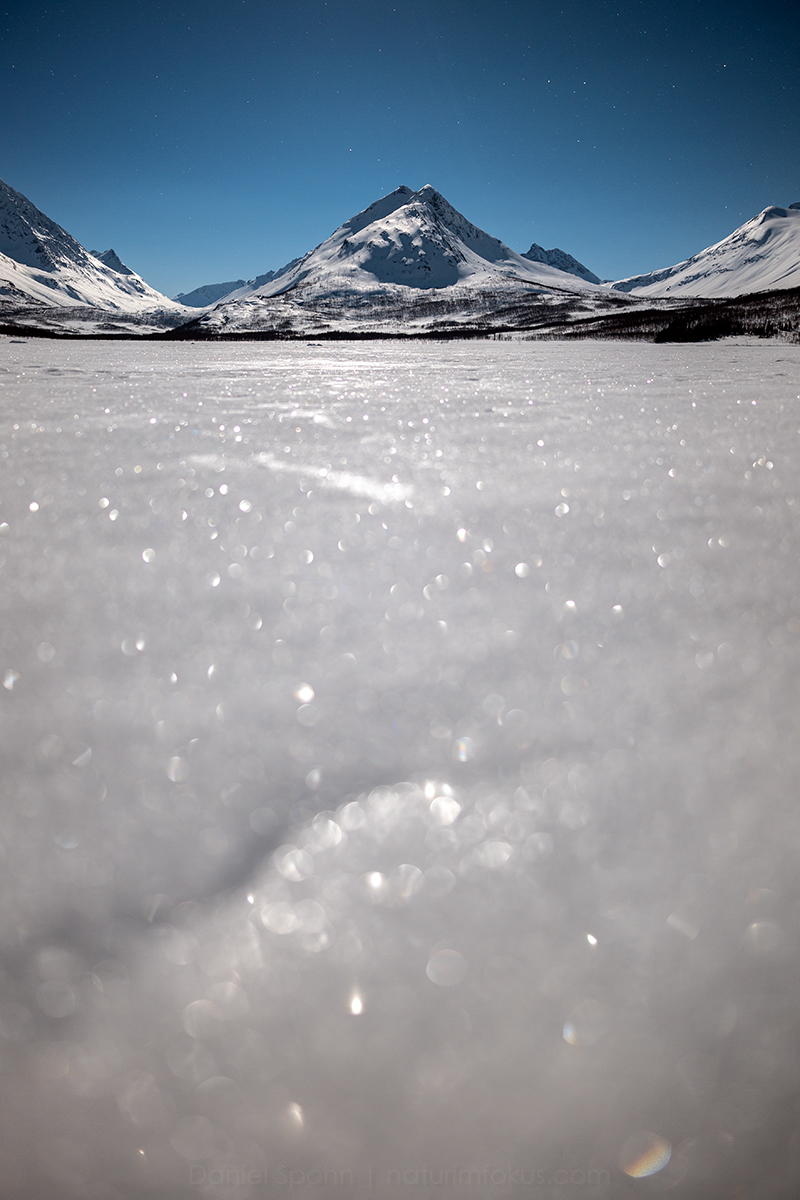 Solange die Sonne nicht scheint, besteht bei schneebedeckter, heller Landschaft oft gar kein allzu großer Helligkeitsunterschied zum Himmel. Daher übersteigt der Motivkontrast den Dynamikumfang der Kamera nicht merklich. Häufig können wir also ganz ohne Hilfsmittel fotografieren und verlieren keine Details in den Lichtern oder Schatten. Besonders gerne nutze ich statt der grellen Sonne das besonders weiche Mondlicht, um die Winterlandschaft zu illuminieren und die Eiskristalle im Vordergrund mit dem Sternenhimmel um die Wette glitzern zu lassen. Natürlich sind die dazu relativ langen Belichtungszeiten nur vom Stativ aus möglich. Dies gibt uns aber immer wieder die Möglichkeit, während den Belichtungszeiten unsere Finger in den Jackentaschen zu wärmen. In einer Winternacht entscheidet vor allem unser Wohlbefinden über die Dauer unseres Fotoausfluges, denn das weiche Licht auf der Schneelandschaft ist die ganze Nacht über äußerst fotogen. Ein schneereicher Winter ist also immer eine wunderbare Zeit für Landschaftsfotografen. Zieht euch warm an, ladet eure Kameraakkus, raus in den Schnee und fangt die vergängliche Winterlandschaft auf euren Kamerasensoren ein.