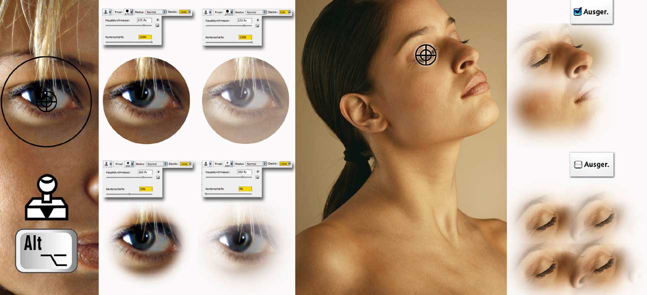 Das Stempel-Werkzeug hat eine ganz einfache Aufgabe: Es kopiert Bildteile von einer Bildstelle zur anderen. Wählen Sie zunächst mit gehaltener Alt-Taste einen Referenzpunkt und tragen Sie diesen dann an einer anderen Stelle auf. Je nachdem, wie weich die Kante Ihrer Werkzeugspitze eingestellt ist und was Sie bei den Deckkraft- und Fluss-Einstellungen gewählt haben, wird der Referenzpunkt ganz oder teilweise aufgetragen. Wichtig ist auch die Stempelausrichtung, die Sie in der Optionsleiste unter der Menüleiste mit der Checkbox „Ausger.“ wählen. Ist der Schalter gesetzt, merkt sich Photoshop nicht den Ausgangspunkt selbst, sondern nur die relative Position des Referenzpunktes zum Anwendungspunkt. Bei deaktivierter Option wird die Bearbeitung immer vom gleichen, als Referenz gewählten Startpunkt aus begonnen. Um überzeugende Ergebnisse beim Stempeln zu erhalten, sollten Sie den Referenzpunkt möglichst oft wechseln. Ab CS3 haben Sie die Möglichkeit, bis zu fünf verschiedene, auf Wunsch auch transformierbare Referenzpunkte festzulegen.
