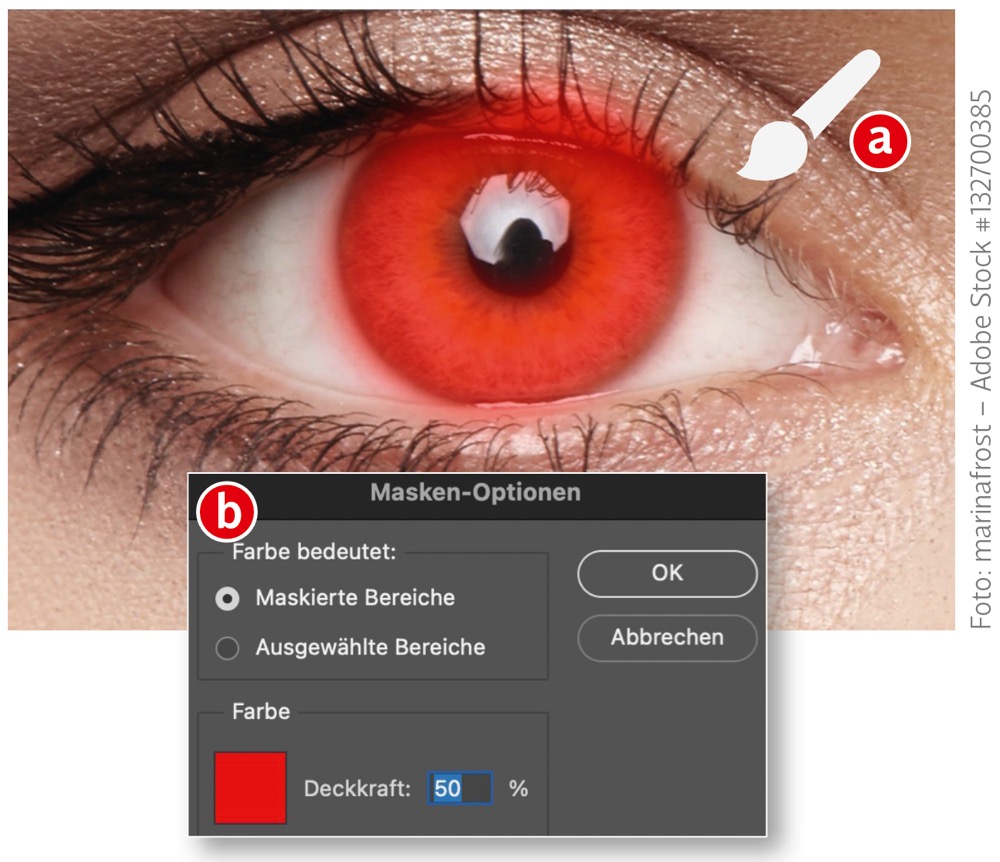 Im Maskierungsmodus (Shortcut »Q«) kontrollieren, erzeugen und korrigieren Sie Auswahlen schnell und unkompliziert mit dem »Pinsel-Werkzeug« (a). Das hat den Vorteil, dass Sie malend und präzise Auswahlkanten folgen können. Dabei lässt sich die »Pinselglättung« nutzen, um eine unruhige Hand auszugleichen. Halten Sie die Shift-Taste gedrückt, erzeugt Photoshop zwischen zwei Pinselabdrücken eine gerade Linie. Sie benötigen eine weiche Auswahlkante? Kein Problem – nutzen Sie eine Pinselspitze mit geringer Härte. Im Maskierungsmodus lassen sich also ohne komplizierte Filteranwendungen Auswahlen erzeugen, die mit Lasso und Co. unmöglich wären. Er ist auch perfekt geeignet, um fehlerhafte Stellen der KI-Auswahlen schnell auszubessern. Mit einem Doppelklick auf das »Maskierungsmodus«-Symbol in der Werkzeugleiste ändern Sie bei Bedarf die Farbüberlagerung (b).
