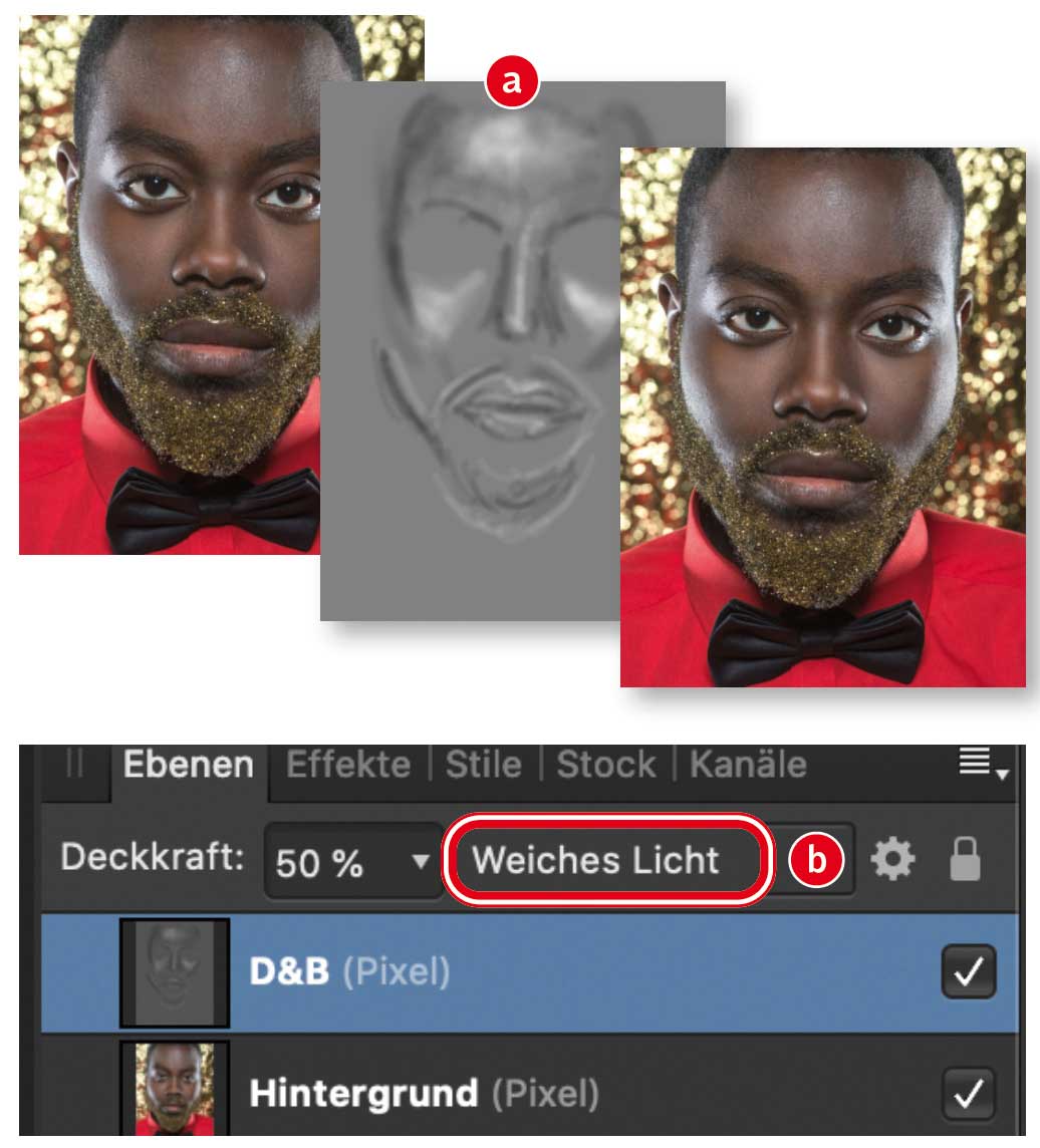 Mit Aufhellen durch Abwedeln (Dodge) und Abdunkeln durch Nachbelichten (Burn) wurden schon in der Dunkelkammer partielle Belichtungskorrekturen ausgeführt. Auch heutzutage wird die Methode Dodge & Burn in der Beautyretusche noch häufig eingesetzt. Durch gezieltes Abwedeln und Nachbelichten können Sie verschiedene Bildbereiche modellieren und deren ­Wirkung stark verändern. Die entsprechenden Werkzeuge »Abwedler« und »Nachbelichter« sind in der »Symbolleiste« von Affinity Photo untergebracht. Wenn Sie mit gedrückter »Alt«-Taste auf das Symbol klicken, wechseln Sie schnell zwischen beiden Werkzeugen hin und her. Arbeiten Sie auf einer neutralgrauen Ebene (a) im Ebenenmodus »Weiches Licht« (b). So bleiben die ­Änderungen non-­destruktiv.