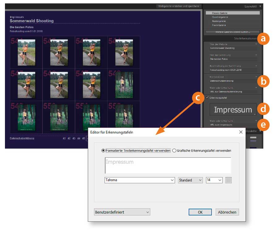 In der rechten Spalte klicken Sie auf »Site-Informationen« (a). Unter »Kontaktdaten« (b) tragen Sie nun Ihre Datenschutzerklärung ein und ergänzen unter »Web- oder E-Mail-Link« den Verweis zu Ihrer persönlichen Datenschutzerklärung. Für das Impressum aktivieren Sie die Erkennungstafel (c). Mit einem Klick auf das Dreieck (d) gelangen Sie zu einem Kontextmenü, in dem Sie »Bearbeiten« auswählen. Im Editor für Erkennungstafeln tragen Sie in das Textfeld „Impressum“ ein und passen die Schriftgröße wie gewünscht an. Mit »OK« bestätigen Sie die Änderungen. Im letzten Schritt ergänzen Sie den Link zu Ihrem Impressum (e). Der Text ist nun mit dem Link zum Impressum verknüpft.