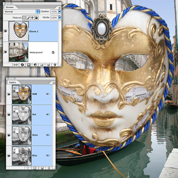 Eine einzelne Ebene einer Photoshop-Datei könnten Sie in der zuvor beschriebenen Weise als neuen Kanal derselben Datei hinzufu?gen. Nehmen wir dieses Bild: Auf der Hintergrundebene die venezianische Kirche Santa Maria dei Miracoli, auf der Ebene daru?ber eine bereits freigestellte Karnevalsmaske. Wir wollen in diesem Fall aber die obere Ebene nicht durch Ebenenverrechnungen in die Szene integrieren, sondern sie als Maske in einem Alphakanal verwenden, der dann als Auswahl geladen und farblich verändert werden soll. Wie gehen Sie dabei am effektivsten vor?