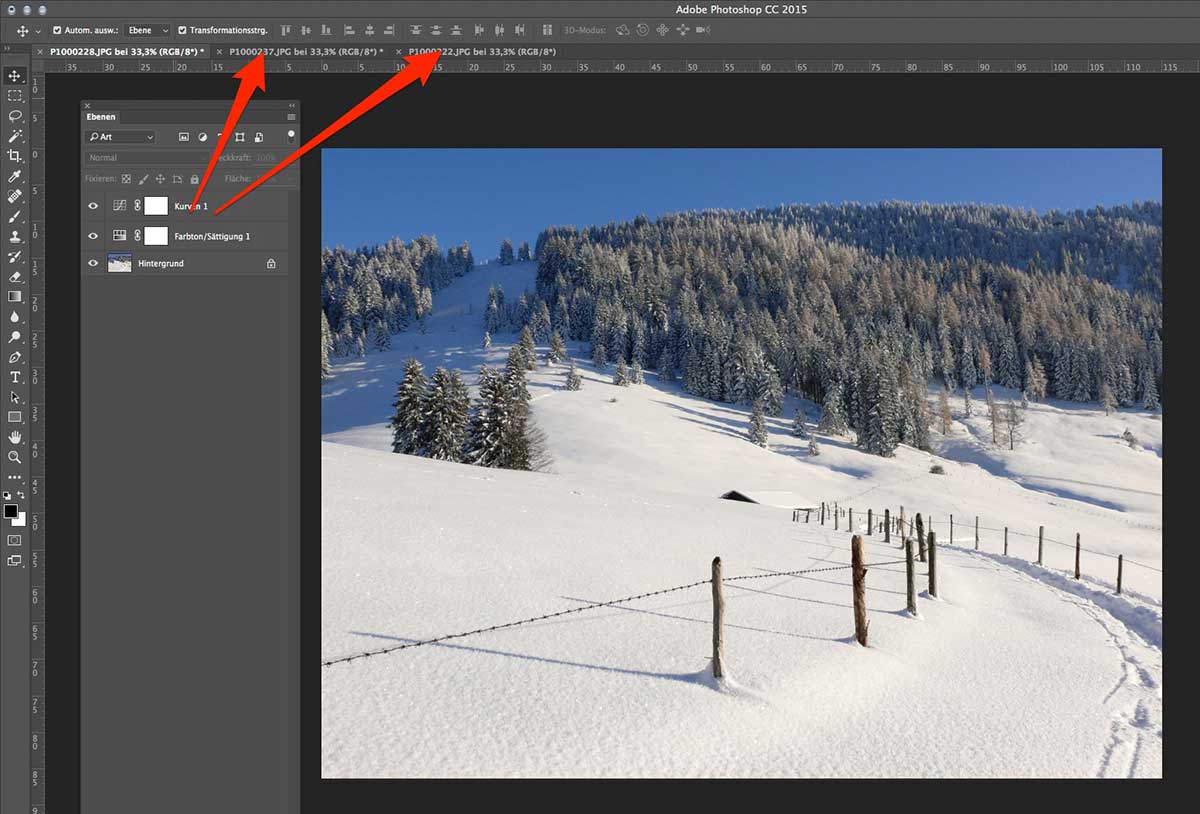 In der neuesten Version von Photoshop CC 2015 gestaltet sich das Ganze einfacher. Jetzt können Sie auch in der Tab-Ansicht Ebenen, Ebenenstile und Einstellungsebenen nach Belieben direkt per Drag & Drop von einem Bild in ein anderes schieben. Dazu genügt es, die Ebene beziehungsweise den Ebenenstil (oder auch mehrere gleichzeitig) von der Ebenenpalette auf den Tab des Zieldokumentes zu ziehen und – nachdem dieses aktiviert wurde – darauf fallen zu lassen. Ein umständlicher Wechsel in die Einzelbild-Ansicht ist damit ebenso überflüssig wie der oben beschriebene Weg mit dem Verschieben-Werkzeug.