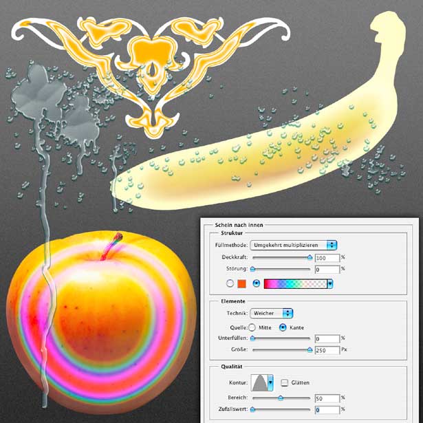 Die Umkehrung des Effektes „Schein nach außen“ ist „Schein nach innen“. In der Praxis wende ich sie meist auf Objekte an wie die hier verspritzte „Flüssigkeit“, bei der allerdings neben diesem Ebeneneffekt zahlreiche weitere verwendet werden wie „Abgeflachte Kante und Relief“, „Schlagschatten“ und andere (ausführlich dazu: „Photoshop-Enzyklopädie“, Band 15, Seite 106 ff. und „Die besten Photoshop-Workshops aus DOCMA“, Band 2, Seite 280 ff.). An „Schein nach innen“ lässt sich gut zeigen, dass viele Ebeneneffekte dann ihren besonderen Reiz zeigen, wenn man sie sozusagen gegen den Strich verwendet. So wurde der Glanzeffekt auf dem Ornament oben links mit einer abweichenden Einstellung für „Kontur“ erzielt, und auf ähnliche Weise entstanden die bunten Ringe auf dem Apfel, wobei zusätzlich ein Spektralverlauf für die Verlaufsfüllung zum Einsatz kam.