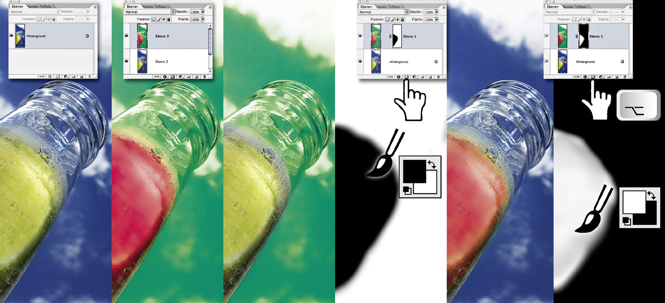 Mit Ebenenmasken blenden Sie den Inhalt einer Ebene ein oder aus. Klicken Sie in der Ebenenpalette auf das Ebenenmasken-Symbol, erscheint neben der Ebenen-Miniatur ein weißes Feld. Wenn Sie es anklicken und dort mit schwarzer Farbe malen, werden die geschwärzten Bereiche ausgeblendet. Wenn Sie mit gehaltener Alt-Taste auf das Ebenenmasken-Symbol klicken, erscheint ein schwarzes Feld neben der Ebenen-Miniatur und der Ebeneninhalt wird zugleich ausgeblendet. Malen Sie auf der Maske mit weißer Farbe, blenden Sie so den Ebeneninhalt wieder ein.