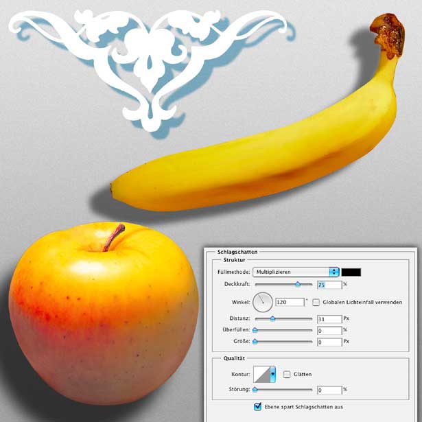 Einer der Ebeneneffekte, der in der Praxis wohl am häufigsten angewandt wird, ist „Schlagschatten“. Sie können die Schattenfarbe wählen, Füllmethode und Deckkraft, mit der er eingefügt wird, den Beleuchtungswinkel sowie die Distanz zwischen Objekt- und Schattenkontur. „Überfüllen“ steht für einen Randbereich, der ohne Abschwächung mit der Schattenfarbe gefüllt wird; der missverständliche Begriff „Größe“ für den Grad der Weichzeichnung. Der Eintrag „Kontur“ im unteren Kasten bestimmt die Zonenformung des Schattens, „Störungen“ seine Auflösung in eine Pixelstruktur mit schwankender Helligkeit. Wichtig beim Einsatz dieses Effekts ist, dass Sie sich vergegenwärtigen, dass hier kein plastisches Objekt einen Schatten wirft, sondern nur dessen flache Entsprechung.