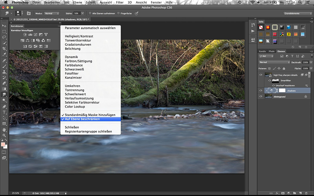 Sie wollen neue Einstellungsebenen in Photoshop direkt als Schnittmasken anlegen? Ändern Sie einfach die gezeigte Option in den erweiterten Optionen des Korrekturen-Fensters. Cmd+Alt+G wäre ansonsten ein nützlicher Kurzbefehl, um Schnittmasken ohne Mausklick zu erstellen und wieder aufzuheben.