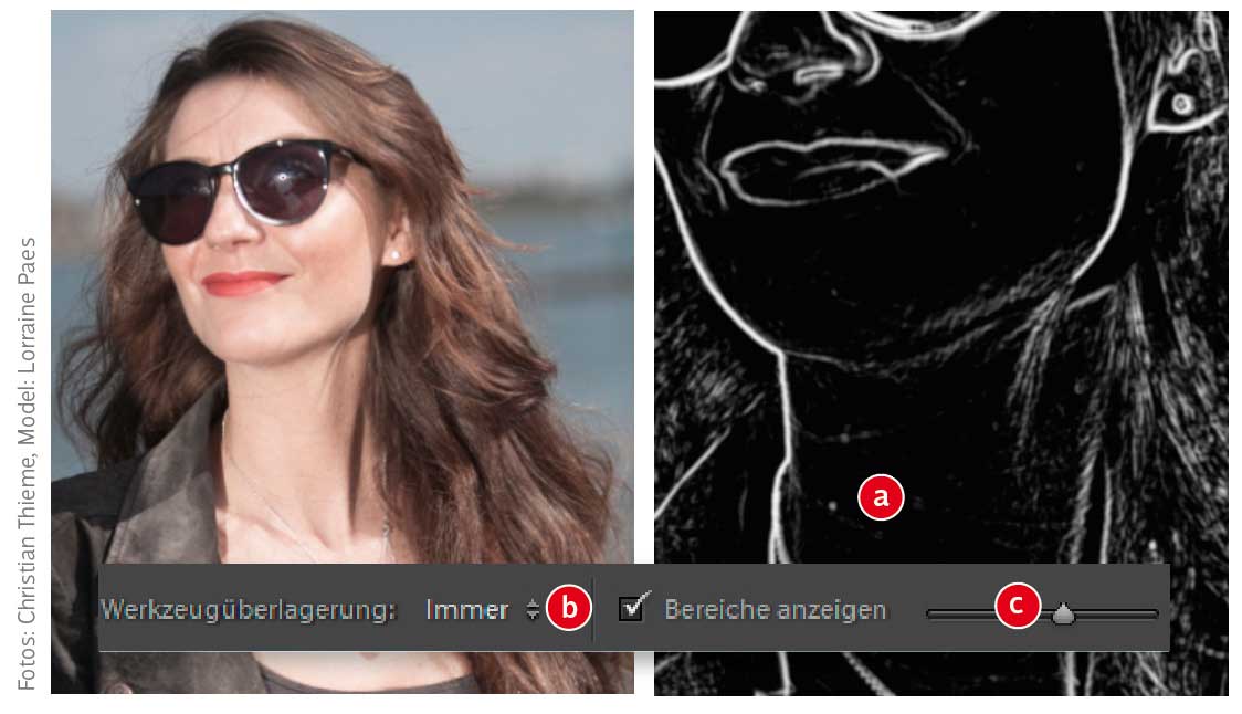 Kleine Hautunebenheiten oder Sensorflecke reparieren Sie in Lightroom Classic mit nur einem Klick. Aktivieren Sie im »Entwickeln«-Modul mit dem Shortcut »Q« die »Bereichsreparatur«. Damit Sie bei einer Porträtretusche Hautunebenheiten wie im Beispiel (a) besser erkennen können, aktivieren Sie die Funktion »Bereich anzeigen« (b). Mit dem Schieberegler (c) stellen Sie die gewünschte Intensität ein. Zur Vergrößerung des Bildausschnitts halten Sie die Leertaste gedrückt und klicken anschließend mit der linken Maustaste auf den zu vergrößernden Bereich. In dieser Darstellung lassen sich die Korrekturen einfacher vornehmen.