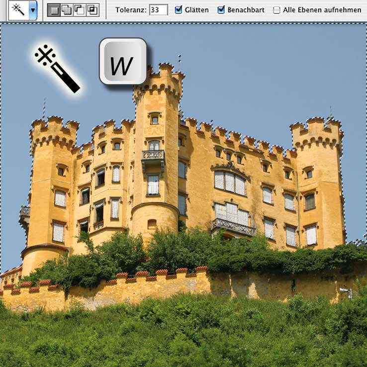 Um den Himmel hinter Schloss Hohenschwangau auszuwählen, könnten Sie selbstverständlich eines der bisher vorgestellten Werkzeuge einsetzen: Lasso, Polygon-Lasso oder Zeichenstift. Aber die Mühe wäre angesichts der vielen Zinnen und Türme beträchtlich. Photoshop verfügt mit dem „Zauberstab“ über ein Werkzeug, mit dem Sie Bereiche mit ähnlichen Farben auswählen, indem Sie in diese Farbfläche klicken. Das Tastaturkürzel für dieses Tool ist das »W«.