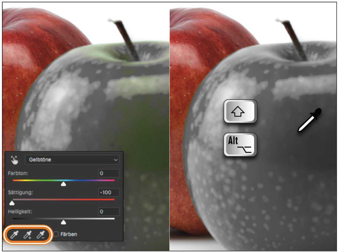Ausgewählte Farbbereiche lassen sich mit Hilfe der Pipetten des Dialogs »Farbton/Sättigung« optimieren. Für das Hinzufügen von Farben wählen Sie die Pipette mit dem Plus-Symbol, für das Abziehen dagegen jene mit dem Minus-Symbol. Auf diese Weise können Sie Farbbereiche auch ohne vorherige Auswahl präzise umfärben.
