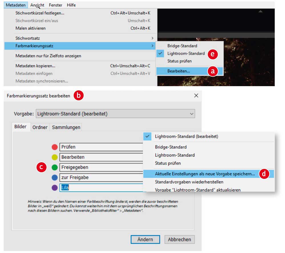 Farbmarkierungen, mit denen Sie Bilder, Ordner und Sammlungen kennzeichnen möchten, können Sie nach Belieben umbenennen. Klicken Sie im »Bibliothek«-Modul auf »Metadaten > Farbmarkierungssatz > Bearbeiten« (a). Im Fenster »Farbmarkierungssatz bearbeiten« (b) legen Sie neue Namen für die Farben (c) fest. Beachten Sie, dass beim »Ändern« die jeweilige Farbmarkierung im Katalog verschwindet. Sie können dies vermeiden, indem Sie die Änderungen als neue Vorgabe im Auswahlmenü (d) speichern. Lightroom zeigt allerdings nur die gesetzten Farbmarkierungen eines ausgewählten Markierungssatzes (e) im Katalog an.
