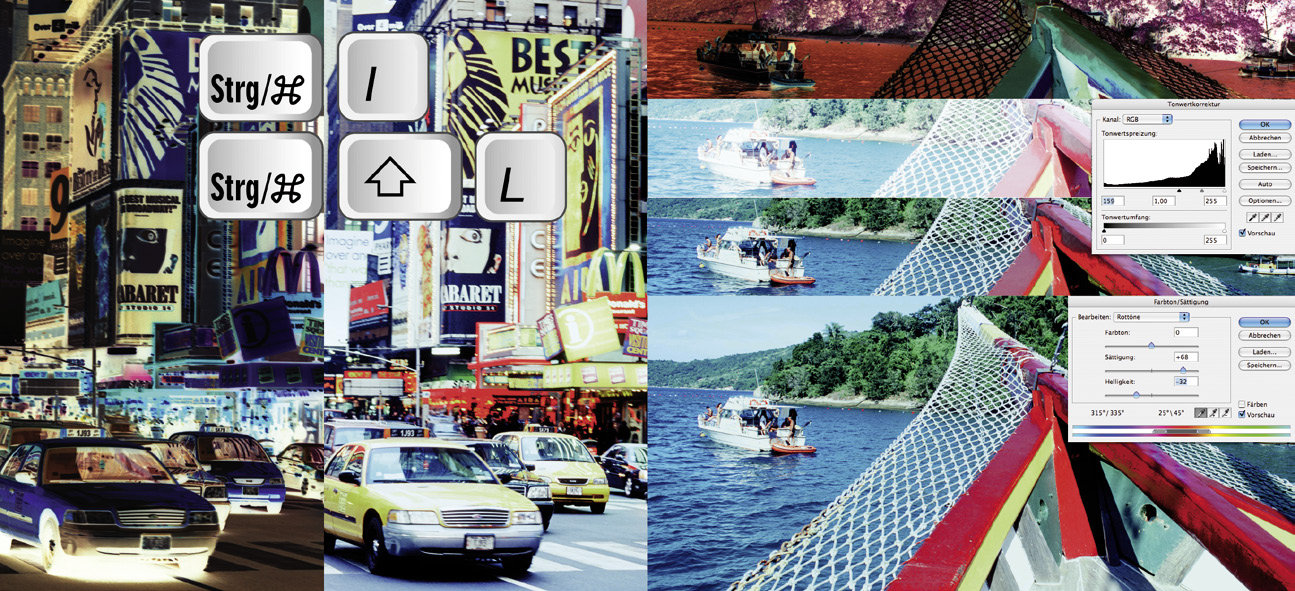 Wer Farb-Negative scannt, kann bei den meisten Scannertreibern eine Option aktivieren, die für eine farbliche Neutralisierung des in der Regel orange beschichteten Originals sorgt. Gute Treiber bieten sogar die Möglichkeit einer Vorwahl, die den Filmtyp berücksichtigt. Wer jedoch unbearbeitete Negativscans weiterverarbeiten will oder Negative mit einer Digitalkamera abfotografiert, muss die Bildfarben mit Photoshops Bordmitteln umwandeln. Die Farbumkehr selbst erreichen Sie mit dem Befehl invertieren, den Sie unter „Anpassen” im Menü „Bild” finden oder mit der Tastenkombination Strg+I (Mac: Befehl+I) aufrufen. Durch die orangefarbene Filmemulsion ergibt sich jedoch zumeist ein unangenehmer Farbstich, der im Nachgang entfernt werden will. Mit etwas Glück reicht es aus, einfach den Befehl „Auto-Tonwertkorrektur” anzuwenden wie im linken Beispiel. Im Beispiel rechts ist mehr Expertise gefragt: Hier muss zunächst die Helligkeit per Tonwertkorrektur gesenkt und anschließend mit der Grau-Pipette des Dialogs durch einen Klick auf ein neutrales Motivelement die farbliche Neutralisierung vorgenommen werden. Da hier die Rottöne partiell zu heftig ausfallen, werden sie abschließend durch eine Korrektur dieses Farbbereichs per „Farbton/Sättigung“ gemildert.