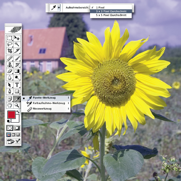 Um sich für die Arbeit der Farbmessung zu rüsten, beginnen Sie damit, das Pipetten-Werkzeug aus der Werkzeugpalette so einzustellen, dass es, statt wie in der Grundeinstellung einen Pixel, einen Durchschnittswert aus drei mal drei, also neun Pixeln, der Messung zugrunde legt. Damit vermeiden Sie Fehlmessungen bei kleinen Darstellungsgrößen.